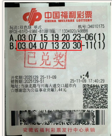 11月9日晚,福彩双色球第2025129期开奖,红球号码为03、04、07、13、20、30,蓝球号码为03。在合肥市,一位幸运购彩者凭借仅4元的投入,幸运中得双色球二等奖,收获奖金143,390元。据了解,这张中奖彩票来自合肥市当涂北路与兴海大道交口的福彩第34010175号销售网点。中奖彩票是一张4元的自选票,包含两注单式号码,其中一注准确命中当期全部6个红球号码,仅因蓝球号码相差1个,未能中得头奖,最终收获了二等奖。