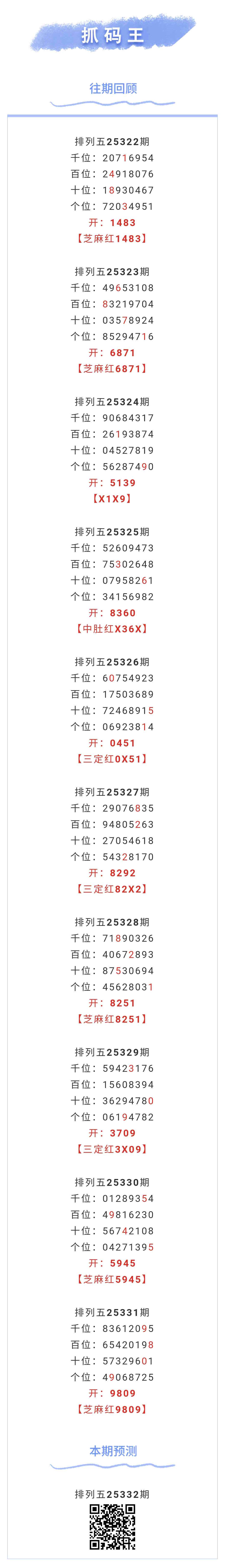 【排列五-332期】芝麻2连红!本月圈红5次芝麻,芝麻近10红5;上期芝麻红9809 发表于:2025-12-12 11:46:05 浏览次数:319 上一篇: 下一篇:没有了 【春哥打奖】 范围码15红11 点播26030期 【天意人生】 范围码15红9 点播26030期 【彩女】 范围码15红9 点播26030期 七星彩杀码荣誉榜
