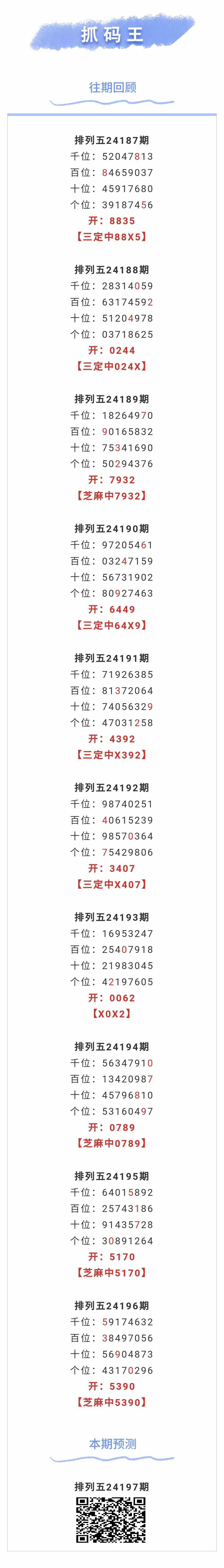 【排列五-197期】本月圈中9次芝麻,芝麻近10中4;上期芝麻中5390 发表于:2024-07-25 14:34:48 浏览次数:433 上一篇: 下一篇:没有了 【春哥打奖】 范围码14红10 更新中 【志存高远1】 范围码15红9 点播26031期 【犀利哥】 范围码15红9 点播26031期 七星彩杀码荣誉榜