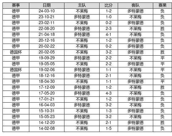 不莱梅 VS 多特蒙德两队近10年的交战次数为21场,不莱梅4胜4平13负,赢球概率为19.0%,平局概率为19.0%,输球概率为61.9%。