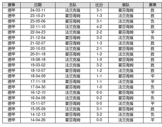 法兰克福 VS 霍芬海姆两队近10年的交战次数为21场,法兰克福10胜6平5负,赢球概率为47.6%,平局概率为28.6%,输球概率为23.8%。