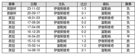 伊普斯维奇 VS 富勒姆两队近10年的交战次数为10场,伊普斯维奇3胜1平6负,赢球概率为30.0%,平局概率为10.0%,输球概率为60.0%。