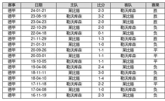 勒沃库森 VS 莱比锡两队近10年的交战次数为16场,勒沃库森5胜4平7负,赢球概率为31.2%,平局概率为25.0%,输球概率为43.8%。