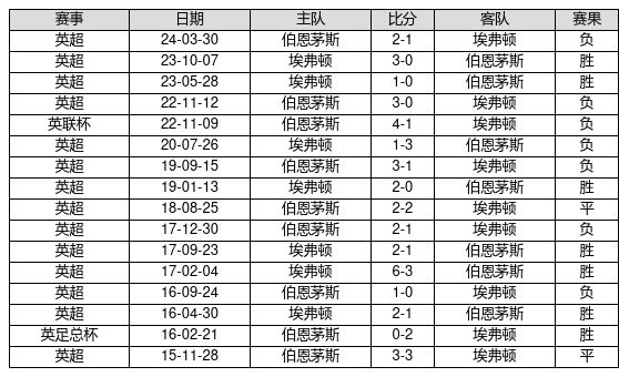 埃弗顿 VS 伯恩茅斯两队近10年的交战次数为16场,埃弗顿7胜2平7负,赢球概率为43.8%,平局概率为12.5%,输球概率为43.8%。