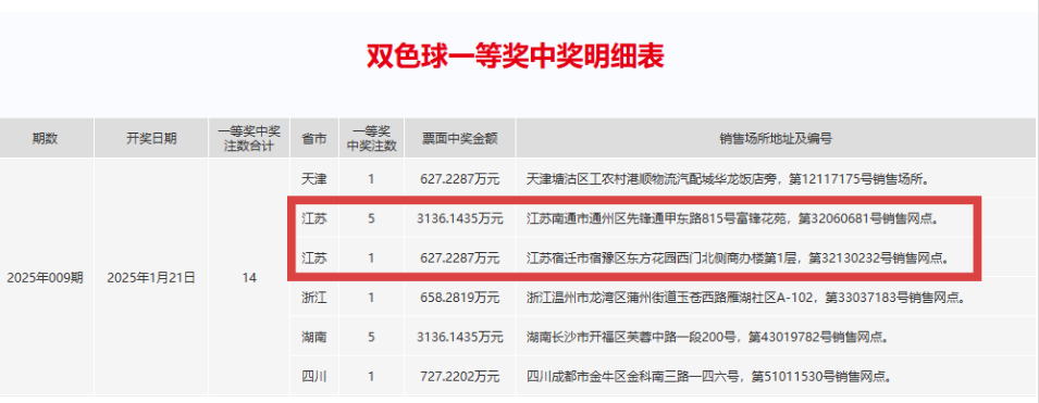 1月21日,中国福利彩票双色球第2025009期开奖,经过激动人心的抽奖环节,本期双色球全国共中出一等奖14注,江苏省的彩民则迎来了幸运时刻,独得其中6注。这一喜讯让江苏的彩民们倍感兴奋,尤其是在南通市通州区和宿迁市宿豫区的购彩者,他们的好运更是令人瞩目。