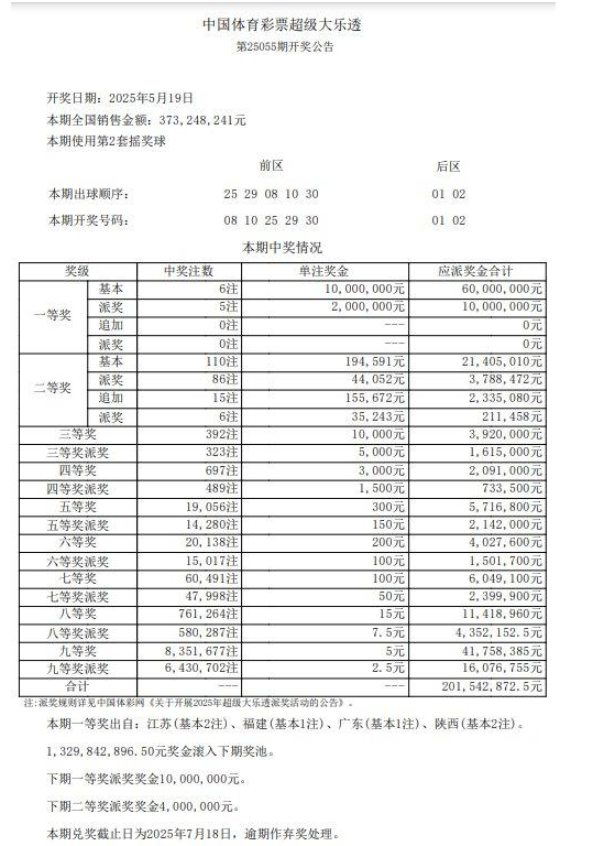 北京时间5月19日晚,体彩超级大乐透第25055期开奖,这是大乐透8.8亿大派奖活动的第18期。当天的开奖号码为:08 10 25 29 30 +01 02。需要特别注意的是,随着本期开奖,大乐透固定奖派奖奖金已全部派发完毕,下期的三至九等奖将不再参与派奖。