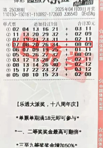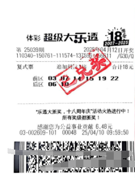 4月9日,体彩超级大乐透第25038期开奖,恰逢超级大乐透8.8亿元大派奖活动的首期。内蒙古通辽市的一位购彩者凭借一张30元10注追加票,赢得1注超级大乐透一等奖,单票奖金为2442万元。根据查询,大奖出自科尔沁区交通工程局11号楼2565号1505062795体彩实体店。